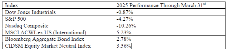 Over the first three months of 2025, we have seen market fluctuations driven by economic shifts, policy decisions, and global events. While volatility can be unsettling, we continue to emphasize a long-term perspective, diversified strategies, and disciplined financial planning to help you stay on track toward your goals.